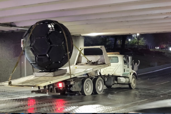 Agencia Reforma Monterrey, NL 20 enero 2026.- Una escultura de un balón se atoró en los bajos de la Macroplaza, cuando era transportada por un camión de plataforma sobre la Calle Zaragoza, en el Centro de Monterrey. El balón, que mide unos 3 metros de alto, no pudo pasar al pegar en el techo de…