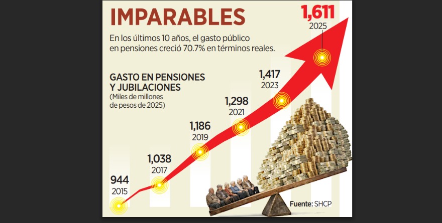 En 2025, el gasto en pensiones y jubilaciones del Gobierno federal rebasó los 1.6 billones de pesos, lo que significó un incremento de 6.8 por ciento real anual, exhiben datos de la Secretaría de Hacienda (SHCP).