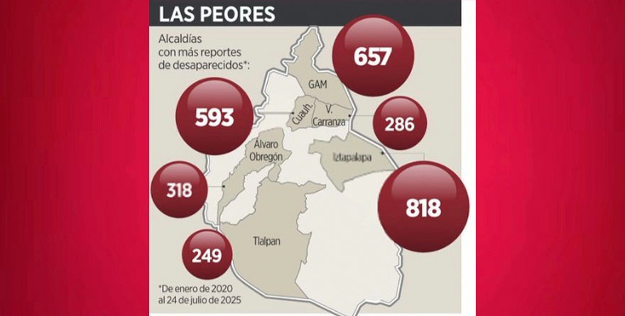 Ciudad de México 27 julio 2025.- Tlalpan es prioritaria para la Comisión de Búsqueda, pero en la Ciudad de México suman seis Alcaldías en alerta por desapariciones e incluyen también a las de Venustiano Carranza, Álvaro Obregón, Cuauhtémoc, Gustavo A. Madero e Iztapalapa.