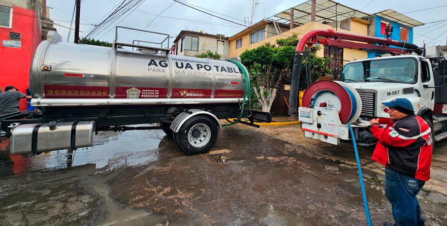 Personal del Grupo Tláloc trabajó en el desalojo del agua con apoyo de dos equipos hidroneumáticos, dos bombas de achique y una pipa, informó la Comisión del Agua del Estado de México (CAEM).