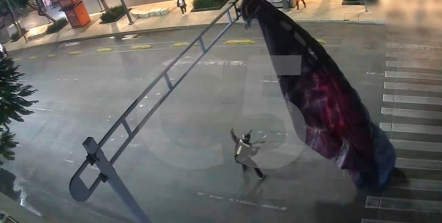 Las cámaras de vigilancia del C5 captaron el momento en el que el paracaídas del hombre, de 36 años, queda atrapado en la estructura ubicada enfrente de Plaza de la Solidaridad, en el cruce de Avenida Juárez y Balderas, cuando el sujeto iba en descenso.