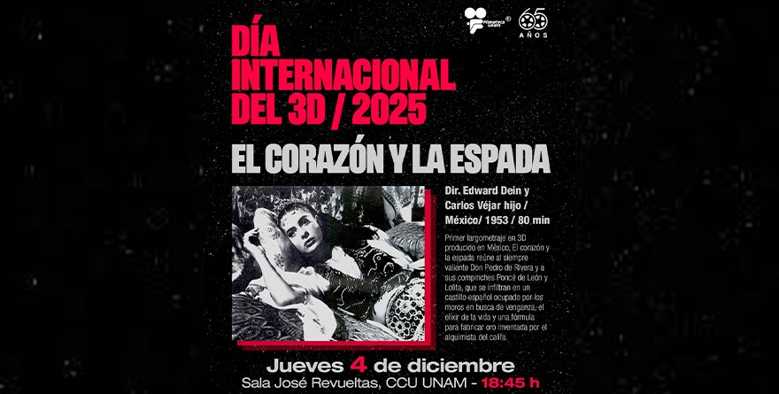 La Filmoteca de la UNAM conmemora el Día Internacional del 3D proyectando «El corazón y la espada» (1953), la primera película mexicana en este formato, dirigida por Edward Dein y Carlos Véjar hijo. Este homenaje a la innovadora tecnología 3D se llevará a cabo el jueves 4 de diciembre a las 6:45 pm en la Sala José Revueltas del Centro Cultural Universitario.