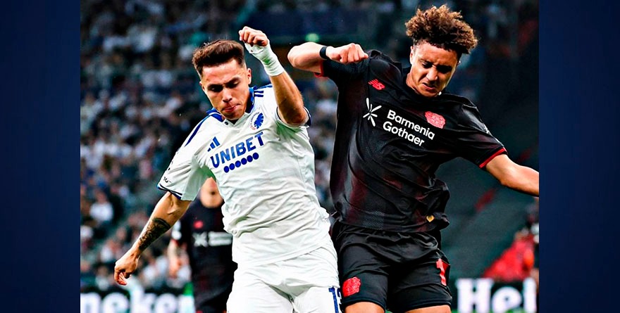 Copenhague, Dinamarca, 18 septiembre 2025.- El defensa mexicano Rodrigo Huescas, debutó en la Champions, jugó los 90 minutos con el FC Copenhague contra el Leverkusen en un partido parejo. El defensa cumplió en defensa y además dio una asistencia, un centro capitalizado por Roberto Silva con certero remate de cabeza, el partido terminó en empate a dos goles por bando.