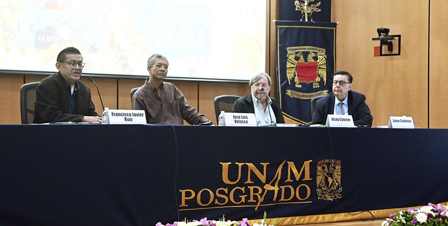En la sala 2 de la Unidad de Posgrado, acompañado por Jaime Cárdenas Gracia, investigador del Instituto de Investigaciones Jurídicas; y José Luis Velasco Cruz, investigador del Instituto de Investigaciones Sociales y doctor en Ciencia Política por la Universidad de Boston, Colomer mencionó que hay varias instituciones en el sistema que favorecen la concentración personalista del poder sobre la presidencia.