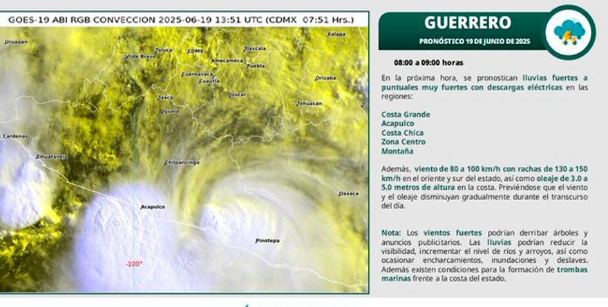 Ciudad de México 19 junio 2025.- El huracán «Erick» tocó tierra está madrugada en la costa de Oaxaca luego de alcanzar la categoría 4 en la escala Saffir-Simpson, con vientos máximos sostenidos de 230 kilómetros por hora.