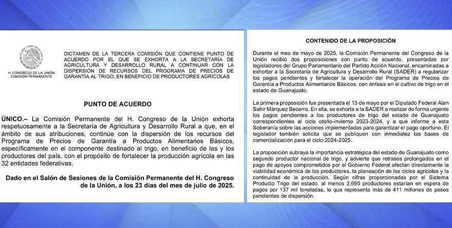 Guanajuato, 23 julio 2025.- El diputado federal Alan Sahir Márquez Becerra logró la aprobación de un exhorto dirigido a la Secretaría de Agricultura y Desarrollo Rural (SADER), con el fin de garantizar el pago pendiente a más de 2,000 productores de trigo en Guanajuato, quienes no han recibido el apoyo correspondiente al ciclo otoño-invierno 2023-2024.