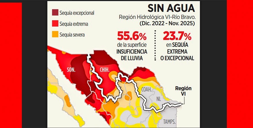 Ciudad de México 12 diciembre 2025.- La región hidrológico-administrativa (RHA) Río Bravo, de donde procede el agua que México entrega a Estados Unidos conforme al tratado bilateral de 1944, ha registrado condiciones de sequía durante los últimos 36 meses, de acuerdo con los registros del Servicio Meteorológico Nacional (SMN).