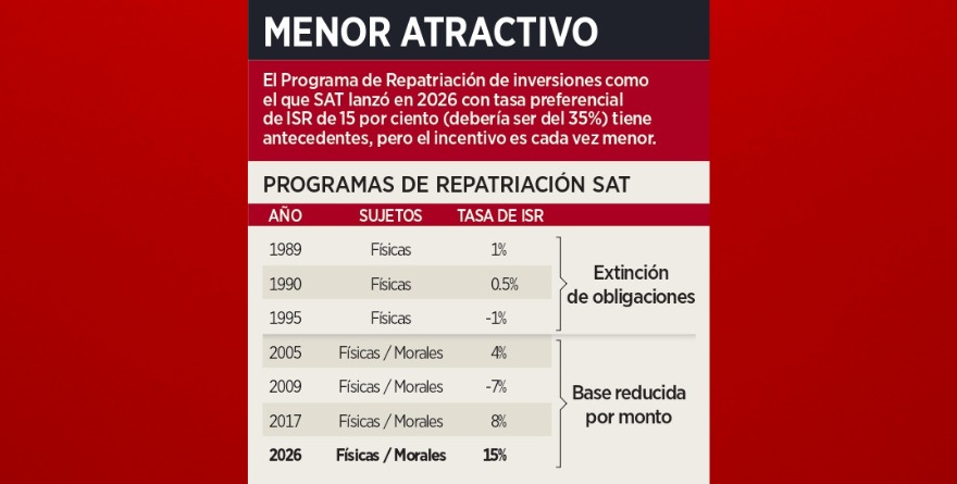 Monterrey, NL 15 febrero 2026.- El «arsenal» fiscalizador del Servicio de Administración Tributaria (SAT) inhibirá el atractivo de su programa de incentivos para la repatriación de capitales que ofrece una tasa máxima de 15 por ciento en el Impuesto Sobre la Renta (ISR), coincidieron especialistas en materia tributaria.