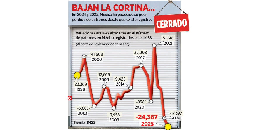 Y en este año la historia es idéntica: se perdieron 24 mil 367 patrones a nivel nacional, otra vez la más grave para un periodo comparable, superando incluso los 17 mil 397 del 2024, que era el peor resultado histórico.